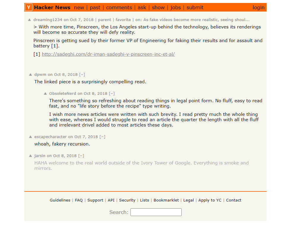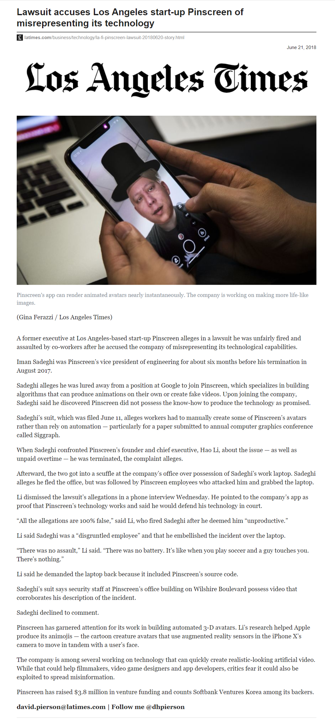 Happy National Honesty Day! Excerpt from the Second Amended Complaint (SAC) fresh out of the legal oven: "After joining Pinscreen under false pretenses, Sadeghi gradually discovered Li’s grotesque scientific and professional misconduct. Among his various transgressions, Li perpetrated a scientific hoax by proclaiming Pinscreen’s avatars to be autogenerated using cutting-edge deep neural networks and artificial intelligence. In reality, the avatars were being manually prepared and tweaked by Pinscreen employees and freelance artists." |